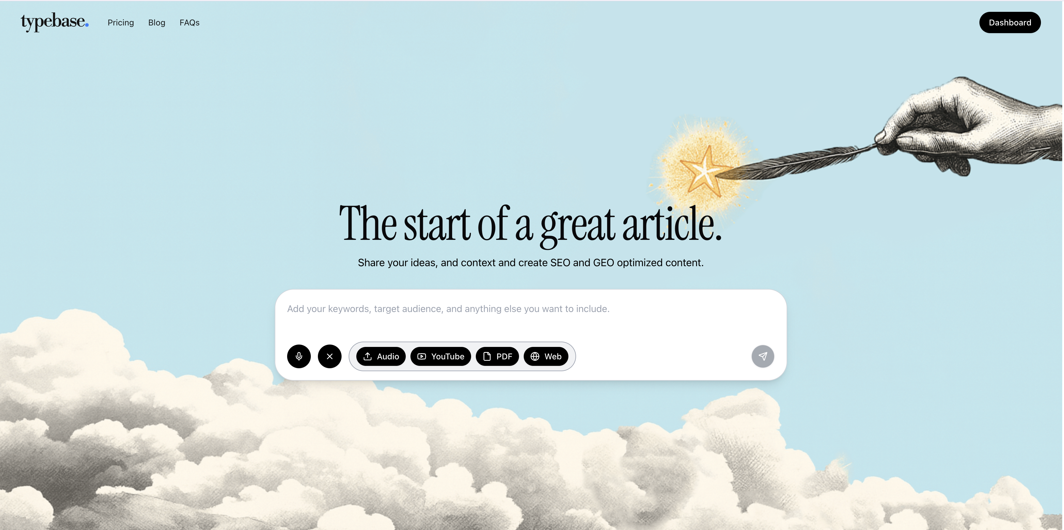 What it solves: Typebase is designed to manage the entire content creation process, from unstructured source material to a published article. It excels at synthesizing information from diverse inputs like audio files, YouTube videos, PDFs, and web links. This dramatically reduces the manual effort of research and first-draft creation for long-form content.